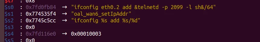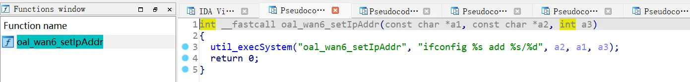可以看到当地址跳转到0x403eb8时,成功执行,由于此漏洞是在设置WAN的时候,造成了命令执行,我们在IDA中快速检索,可以看到如下函数