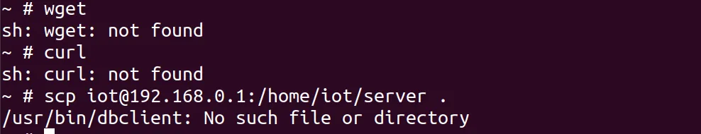 为了进行远程gdb调试,需要将gdb服务端传入到系统中,由于系统本身的busybox进行了阉割,wget,curl等命令都没有,scp命令存在,由于模拟环境下scp会报dbclient缺失错误