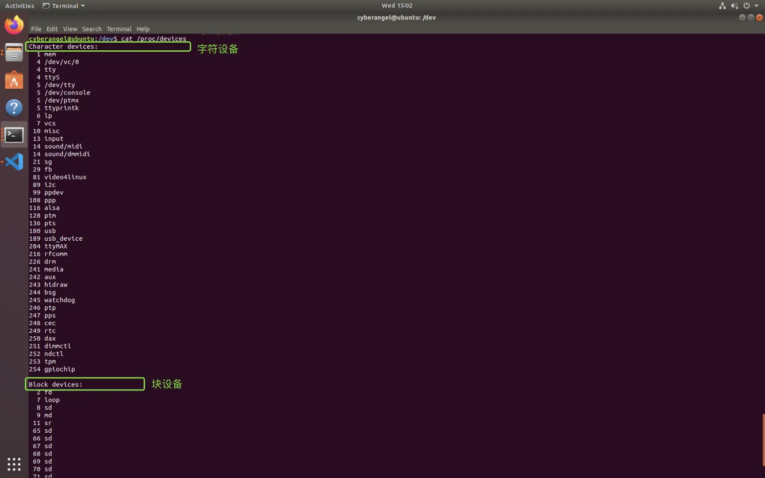 若只需要查看系统中存在的主设备号和与之对应的设备文件,执行cat /proc/devices即可: