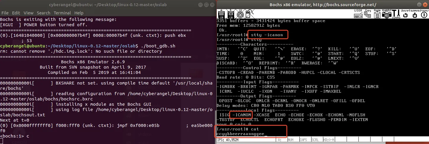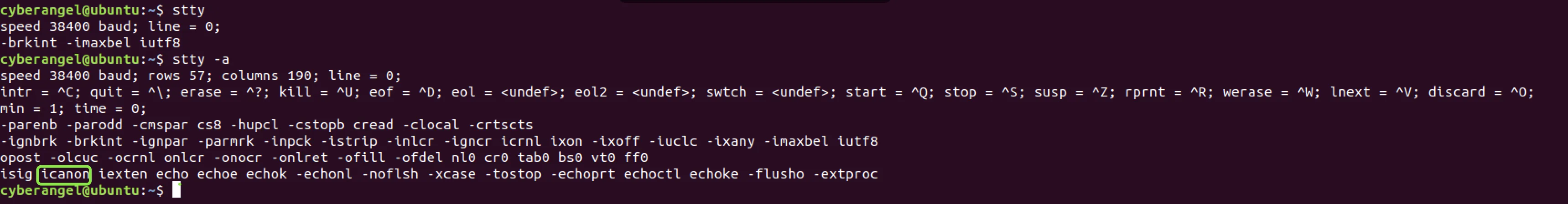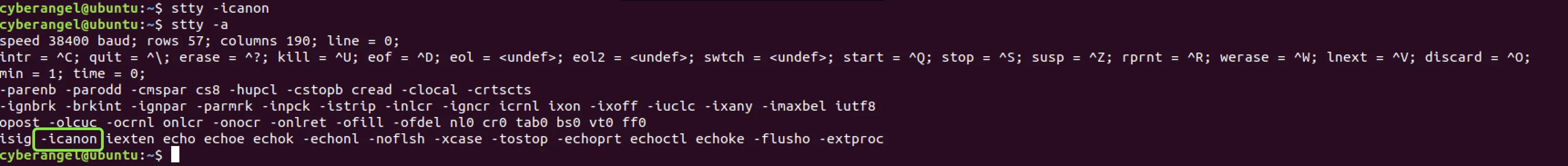 看到上图绿框中的icanon了吗?这个flag标志着canonical规范模式的开启,即icanon表示当前终端窗口使用的是规范模式。紧接着执行cat命令,输入cyberangel: