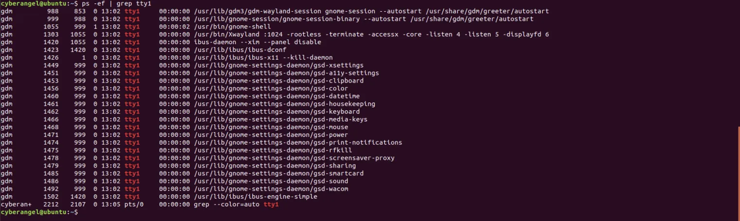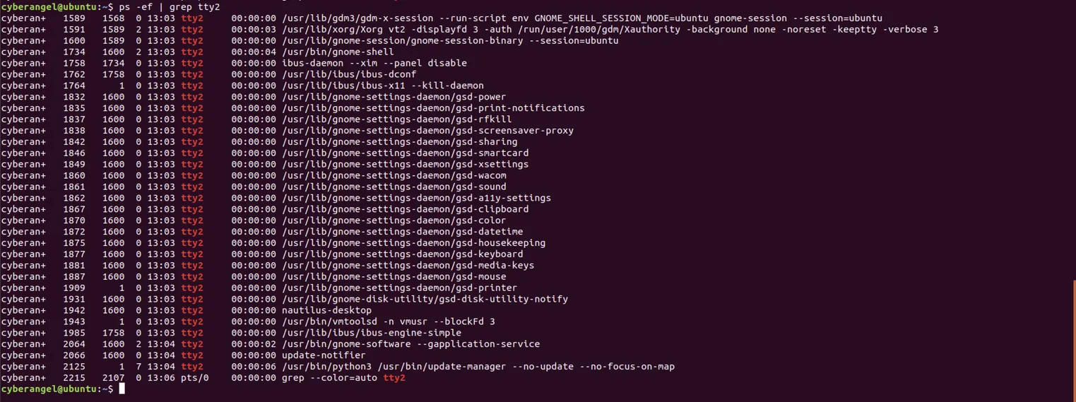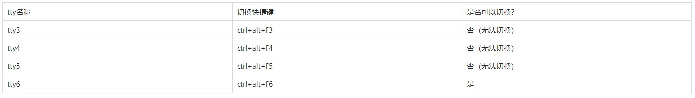 在重启后且登录前按下ctrl+alt+F2会直接来到tty2的命令行界面,回到图形化界面输入账号密码登录后输入ps -ef | grep tty发现gnome占用的不再是tty2而是tty3。在略微极端的情况下比如在登录前按下ctrl+alt+F2 ~ ctrl+alt+F6,则gnome会占用tty7: