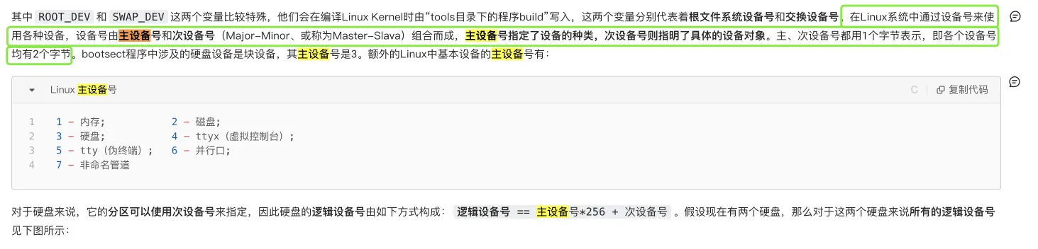 主设备号与次设备号在bootsect.S一文中有所说明,如下图所示: