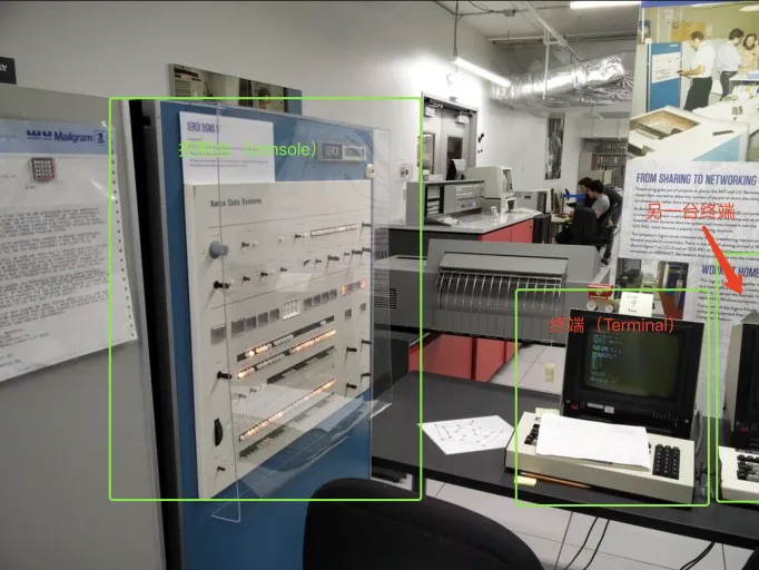现在的一些数控设备(比如数控机床)的控制箱,通常会被称为控制台:顾名思义,控制台就是一个直接控制设备的面板,上面有很多控制按钮。 相应的,在计算机的早期时代这两个概念的确指的是不同的东西,在计算机刚刚诞生的时候,一台电脑的体积非常的大,上面分布着许多的按钮,它们用来"直接控制"主机,这些按钮的集合我们可以称之为控制台(console);一台主机可以支持多个用户同时使用,每个用户使用的设备被称为终端(Terminal),每台终端需要使用物理线缆与控制台相连: