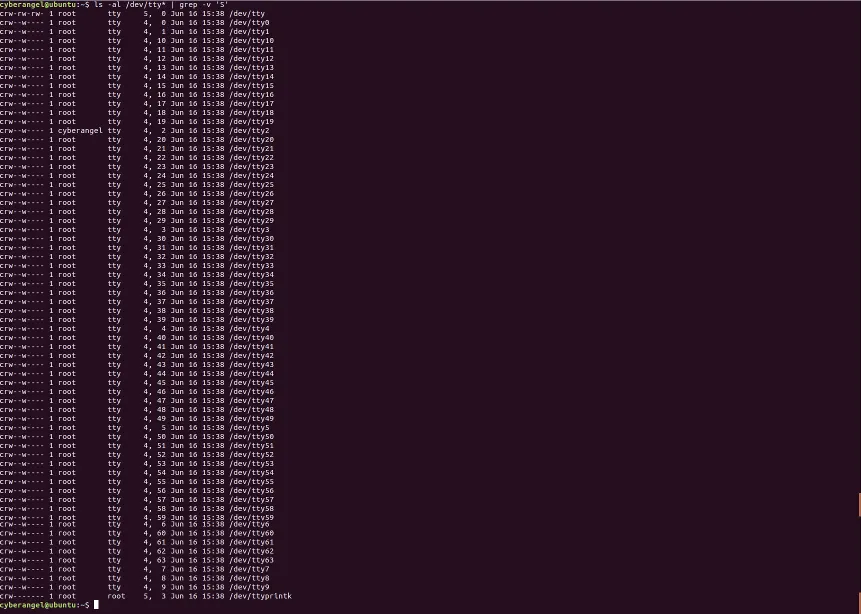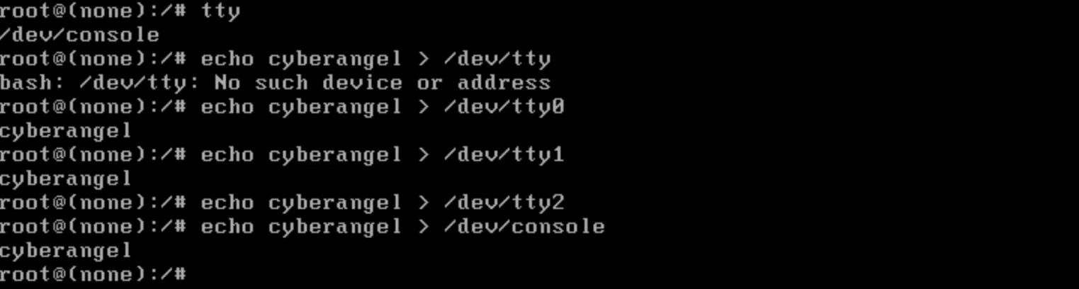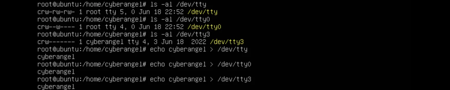 如上图所示,使用echo分别向字符设备文件/dev/tty、/dev/tty3、/dev/tty0写入cyberangel,写入之后均会在屏幕上显示cyberangel字符串,所以可以得出如下结论: