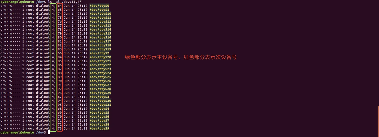 与/dev/ttyN不同,ttySN的"S"表示Serial(串行的),计**算机把每个串行端口都看作是一个字符设备,这些串行端口对应的字符设备文件名是/dev/ttyS0、/dev/ttyS1等,设备号依次为(4,64)、(4,65)等,分别对应于DOS系统下的COM1、COM2,通过该字符设备就可以对连接到计算机的终端设备(不一定是实体的)进行操作。**相同的,若要向一个端口发送数据,可以在命令行上把标准输出重定向到这些特殊文件名上即可。例如,在命令行提示符下键入echo test > /dev/ttyS1会把单词”test”发送到连接在ttyS1(COM2)端口的设备上。个人感觉该种字符设备文件多用于嵌入式开发和双击调试。