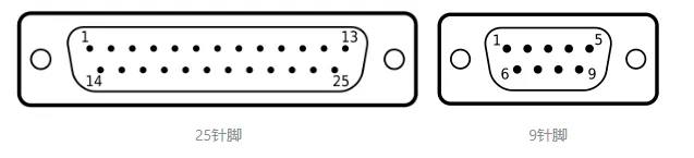 因为RS-232C的重大影响,目前已几乎不再使用RS-232中规定的25针脚而是使用9针脚,因此现在谈到RS-232时一般指的是RS-232C,如下所示: