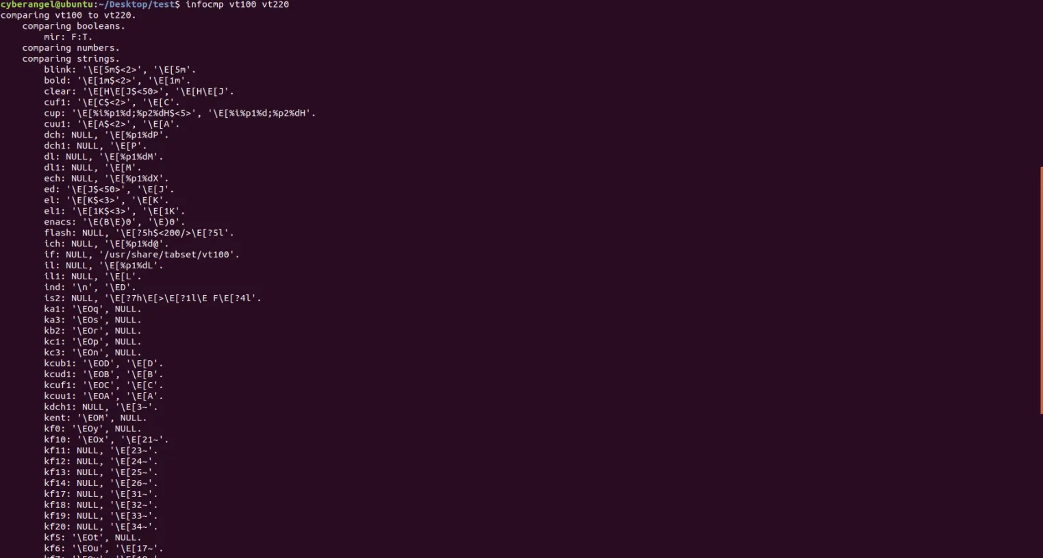 可以通过命令infocmp来比较两个终端的区别,比如infocmp vt100 vt220将会输出vt100和vt220的区别: