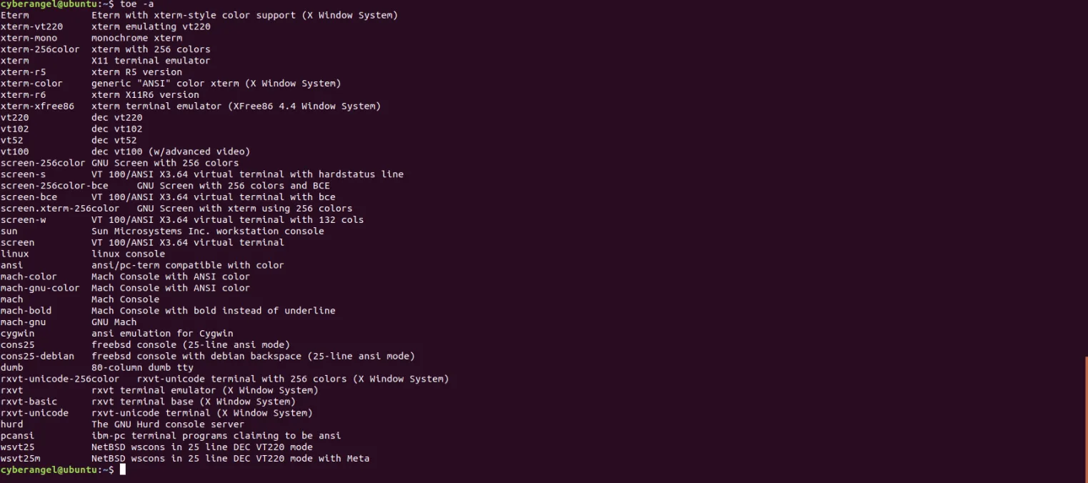 现在所说的终端(Terminal)是由软件模拟的,换句话说就是终端模拟器(Terminal Emulator、或终端仿真器)【如上图所示】。随着计算机的发展已经见不到专门的终端硬件了,但是由于人们的习惯性称呼,现在仍然会将终端模拟器称之为(或简称为)“终端”,可以使用命令toe -a查看系统支持的终端类型: