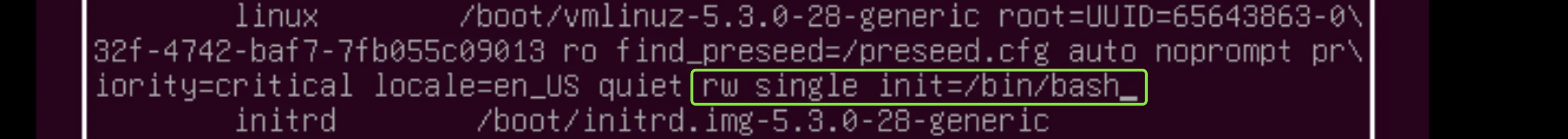 在末尾添加rw single init=/bin/bash,然后按CTRL+x或直接按F10即可进入单用户模式,此时用户即为root用户:
