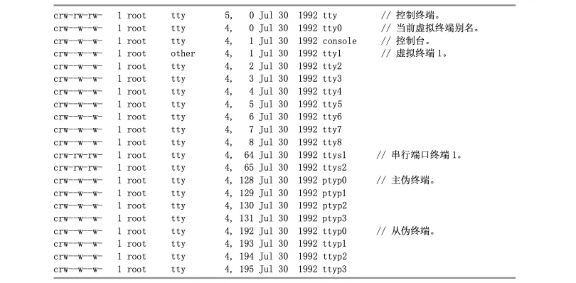 Linux系统中还存在有很多其他种类的字符设备,例如针对ISDN设备的/dev/ttyIn,这里不再赘述了。
